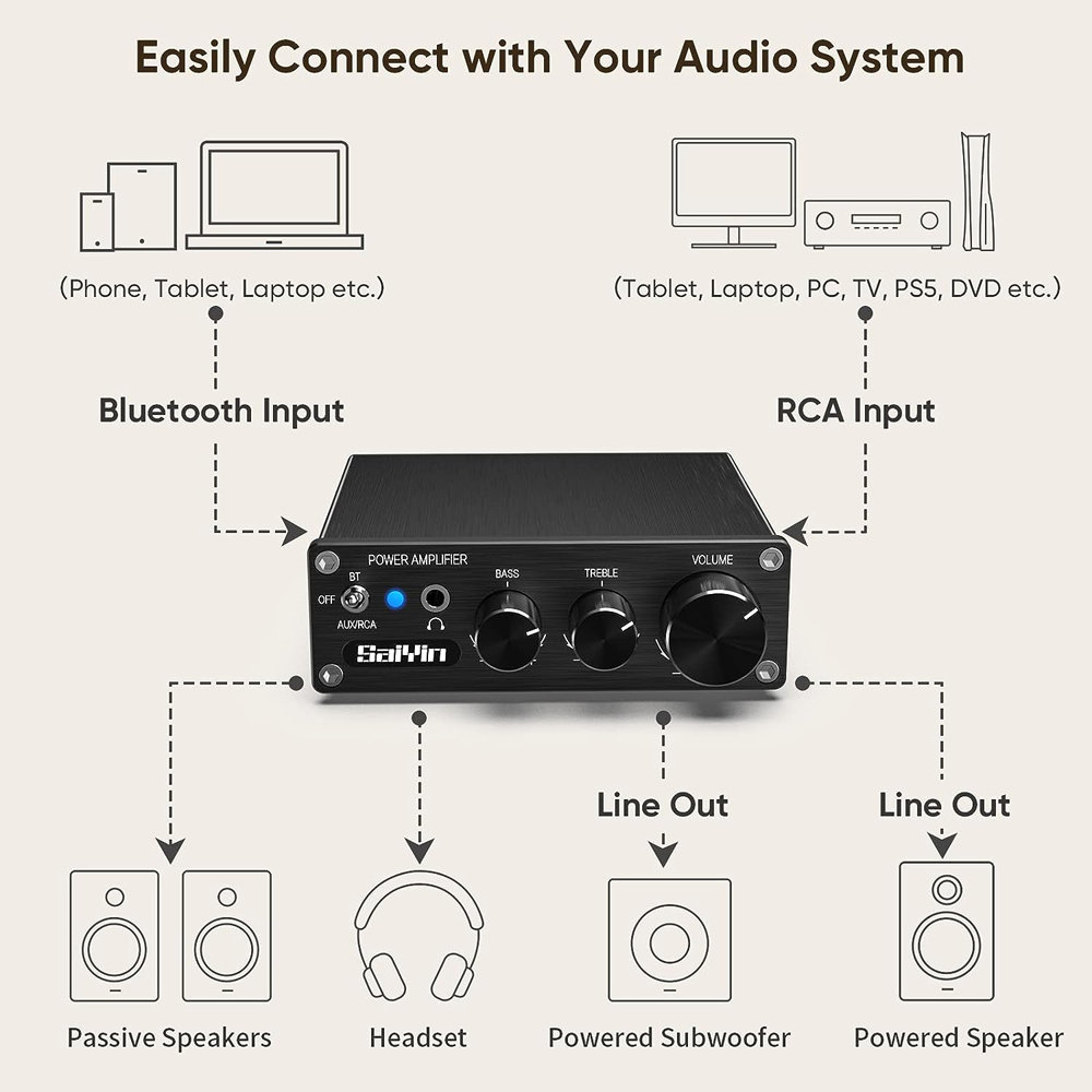 Easy To Set UP: Supports Bluetooth, AUX and RCA inputs to drive most home passive/powered speakers, powered subwoofer, headphones. Treble/bass and master volume knob controls for richer, clearer sound