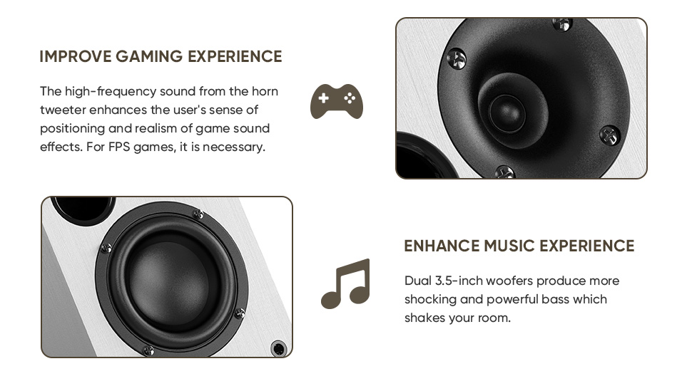 【Dual Horn Tweeters】The tweeter on the Saiyin computer speakers has a unique acoustic design which combines the advantages of horn and silk dome. Sound from the computer speakers is spacious and smooth with the help of silk dome horn tweeter. Most of sound like falling leaves, water drops and footsteps in gaming also becomes extremely clear and full of details.