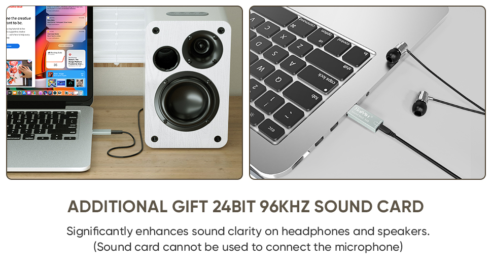 【External Sound Card Included】24bit/96kHz external sound card is gifted to customer who purchases the pc speakers. Sound card helps reduce signal loss from digital audio to analog audio, which definitely improve sound quality of computer speakers or your headset.
