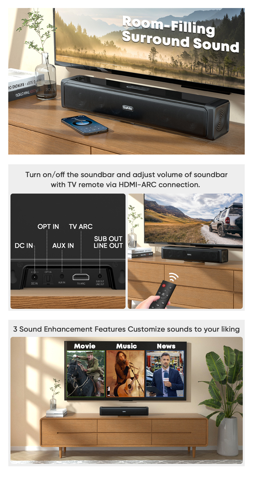 Stream Audio with Bluetooth: Our soundbar allows you to connect your devices seamlessly via Bluetooth, so you can easily stream your favorite music,podcasts, and more from your smartphone, tablet, or other Bluetooth-enabled device. The TV sound bar also offers multiple connectivity options, including HDMI ARC, Optical and AUX, allowing you to connect it to various devices such as TV, Computer, Projector. Note:Plug the HDMI cable(not supplied) into a port on your TV labeled HDMI ARC, not HDMI.