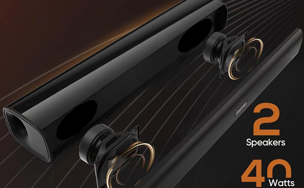 【Powerful Sound from an Ultra Compact Sound Bar】The soundbar(40 Watts) is built with double full-range speakers that provide a powerful and immersive audio experience. At just about 2” tall, the TV soundbar fits most spaces — easily mount it on wall or place in front of your TV. The soundbar won’t block your TV’s bottom edge or remote sensor.This is a great entry-level soundbar.