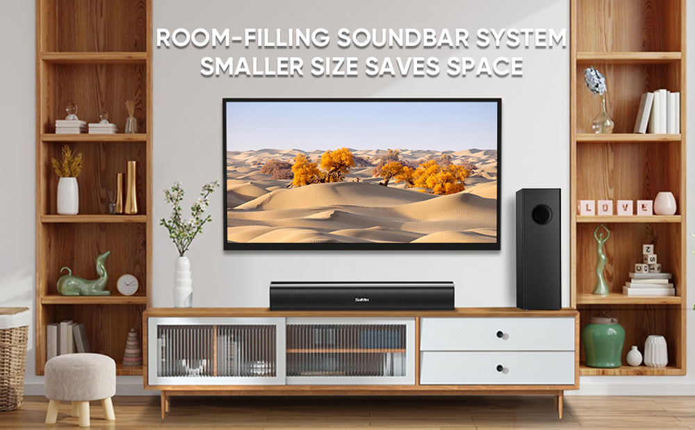 【3 Sound Effect Modes】The TV sound bar can be switched to three equalizer modes which give amazing clarity and precision, and let you enjoy all the details of dialogue, music, and movie; You can use the remote control to select your favorite specialized mode so that you can enjoy cinematic surround sound in your home.